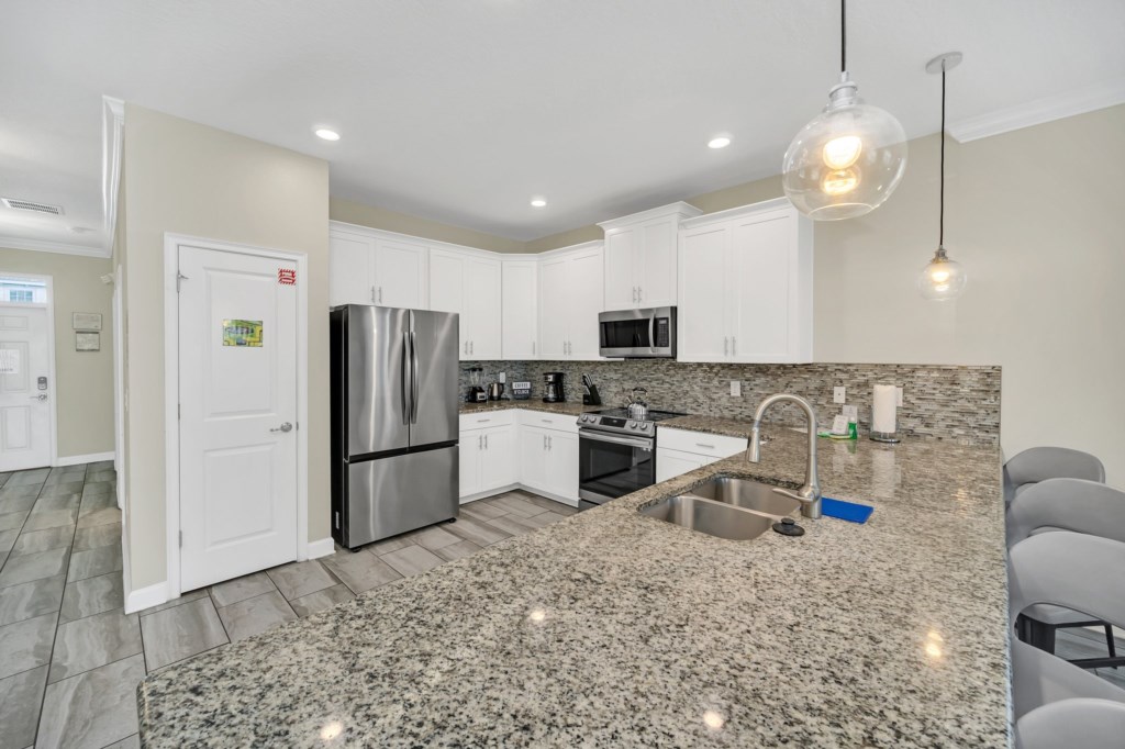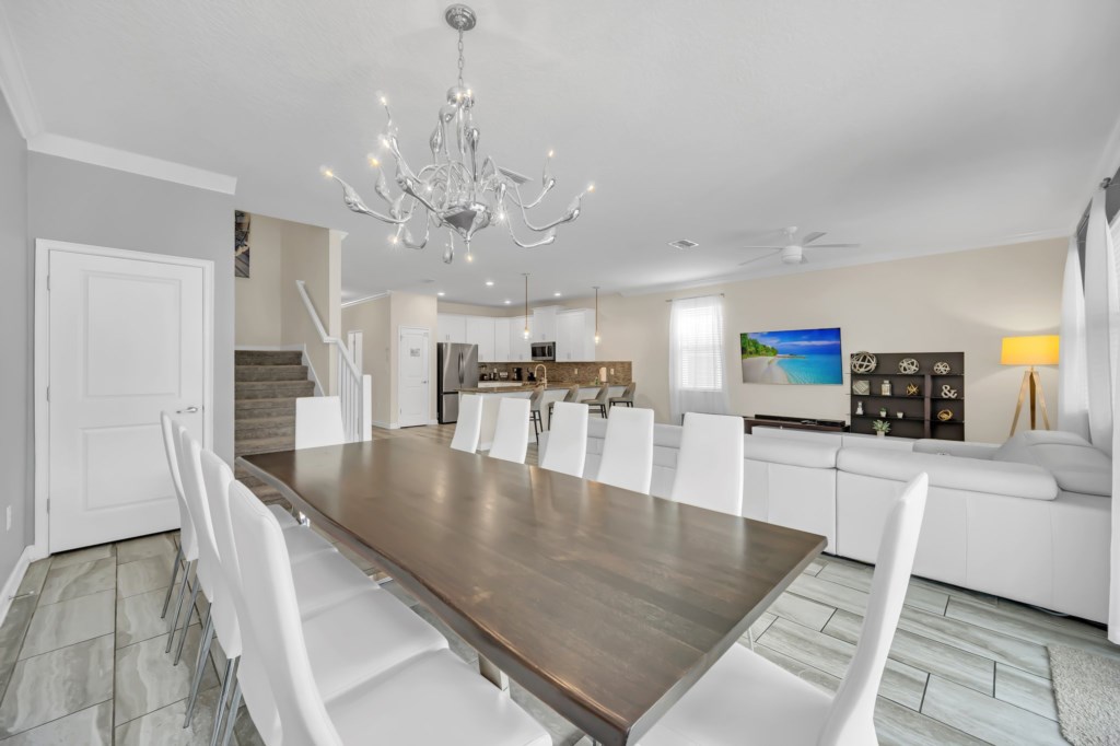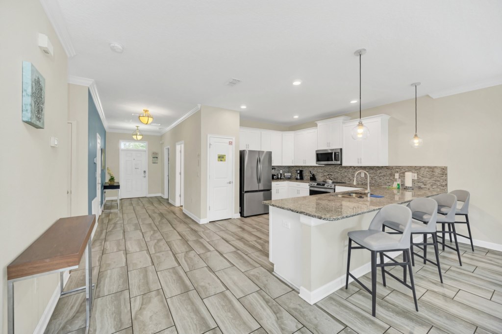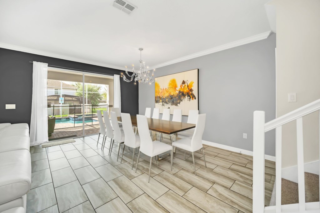 Step outside to your private screened-in pool, complete with sun loungers and outdoor patio furniture, the perfect place to unwind, soak up the Florida sunshine, or enjoy a meal al fresco. A child safety pool fence provides peace of mind for families with little ones.