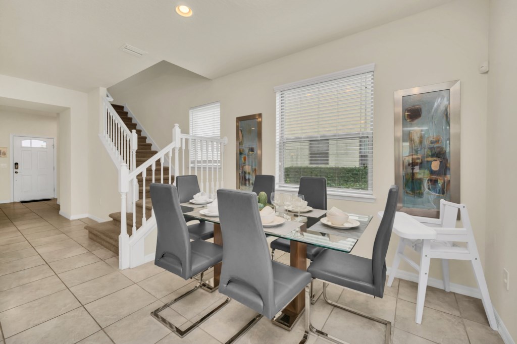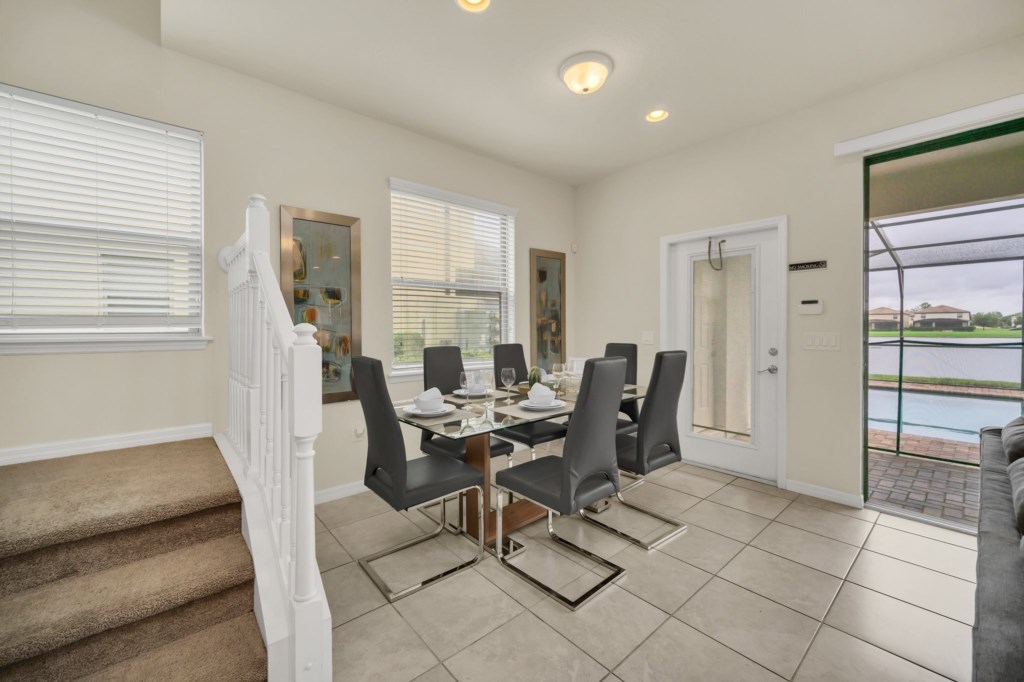 The villa features a fully equipped gourmet kitchen with granite countertops, stainless steel appliances, custom cabinetry, and a breakfast island with seating. The adjacent formal dining area provides the perfect space for shared meals and family gatherings.