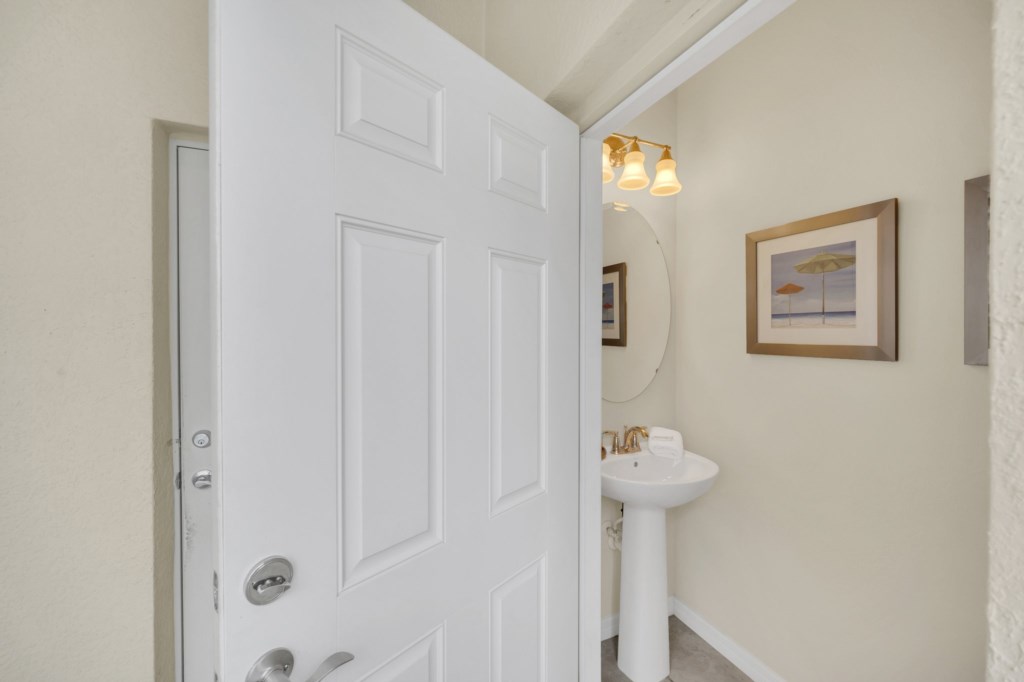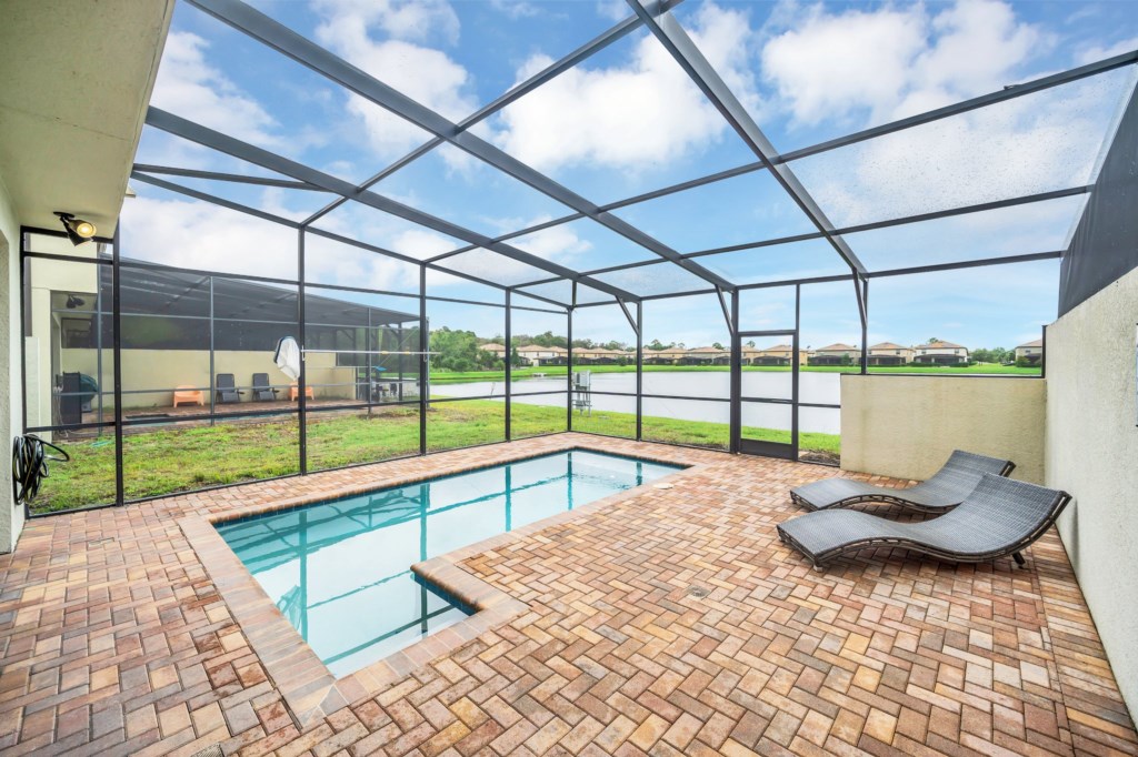 Relax and unwind in the private screened-in pool and spillover spa, complete with sun loungers and outdoor patio furniture, ideal for soaking up the Florida sunshine or enjoying evenings under the stars. A convenient half-bathroom near the pool adds ease for guests enjoying the outdoor space.