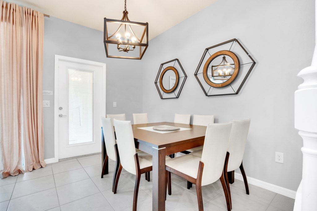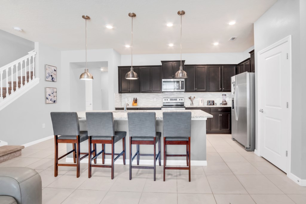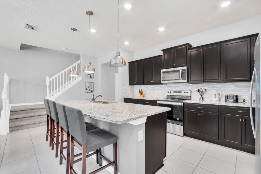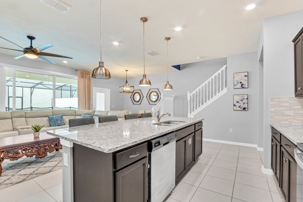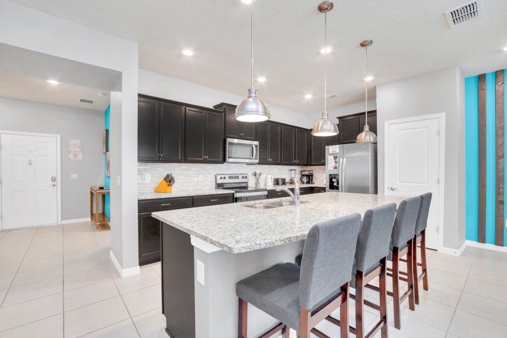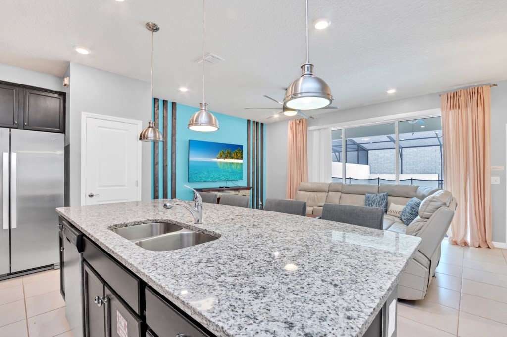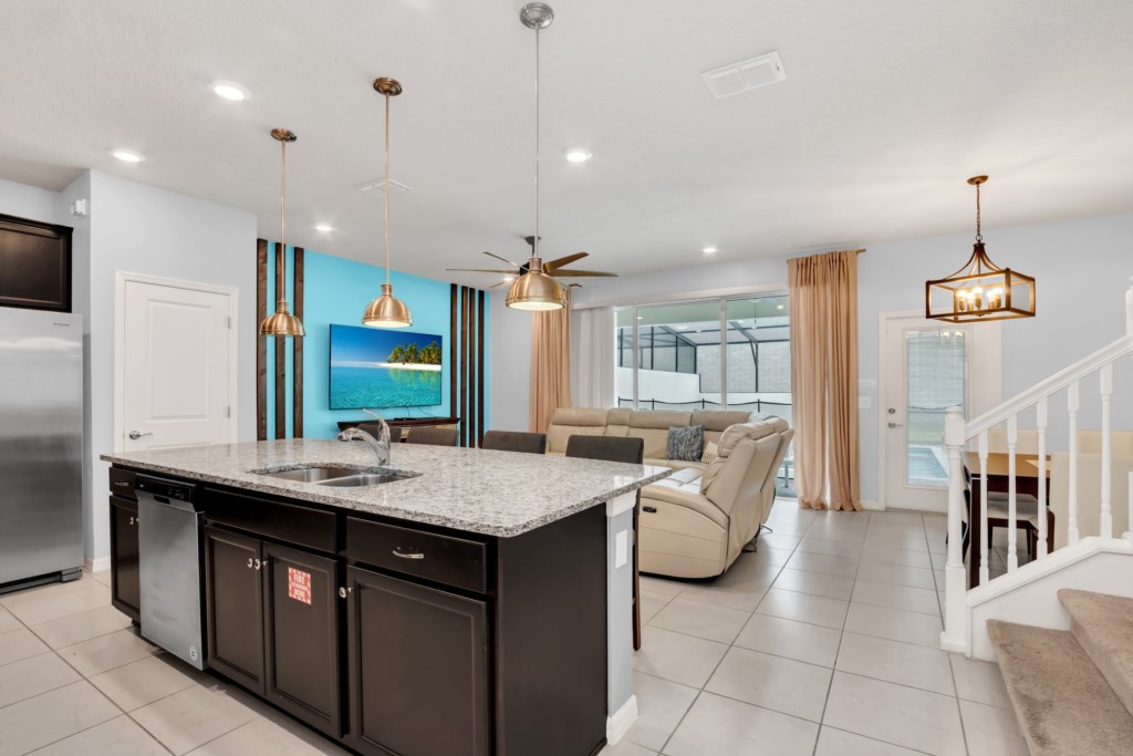 Step inside to an open-concept living space with a fully equipped kitchen, complete with granite countertops, stainless steel appliances, and a breakfast island. Gather for meals in the formal dining area or enjoy casual dining by the pool.