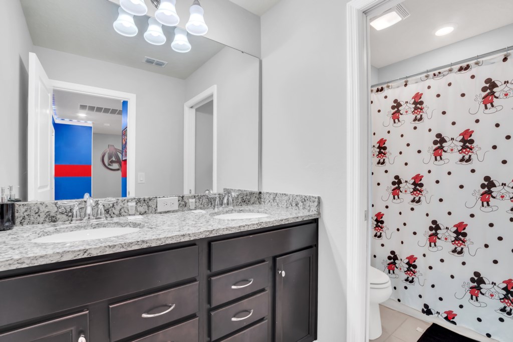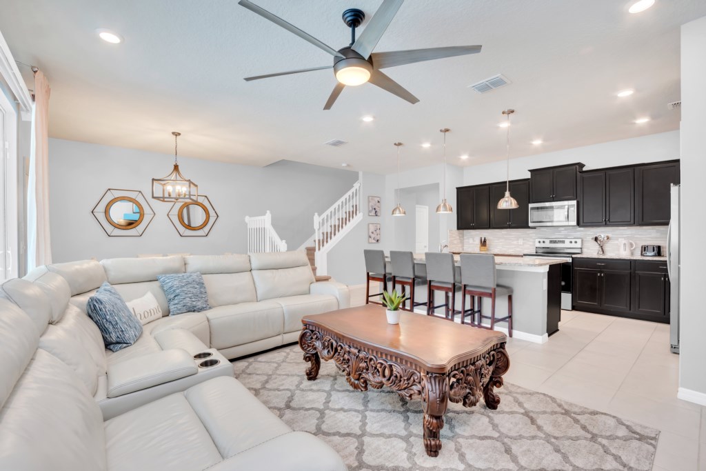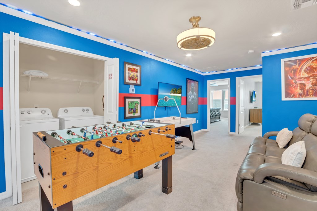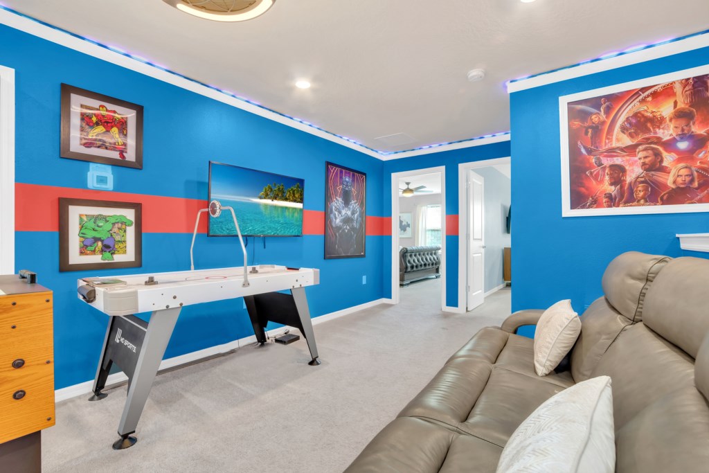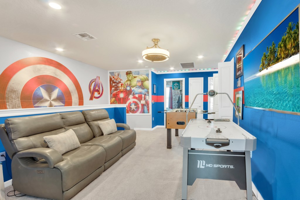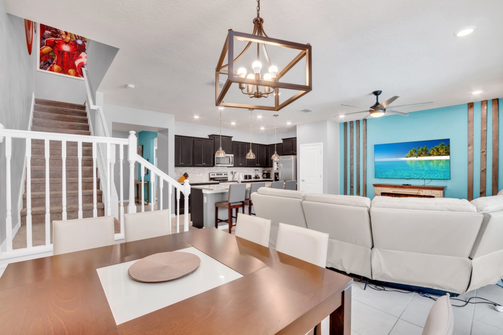 Upstairs, kids (and kids at heart) will love the Mickey and Harry Potter themed bedrooms, while adults can retreat to the luxurious king suites with private bathrooms. The villa also features smart TVs in all rooms, high-speed WiFi, and central air for your comfort.