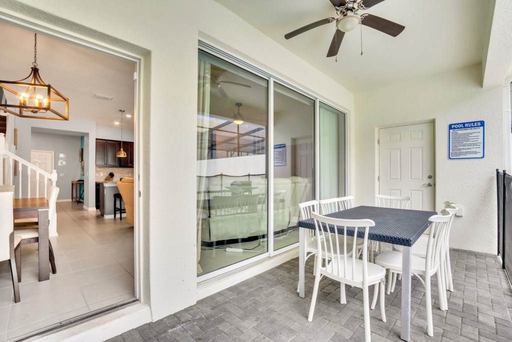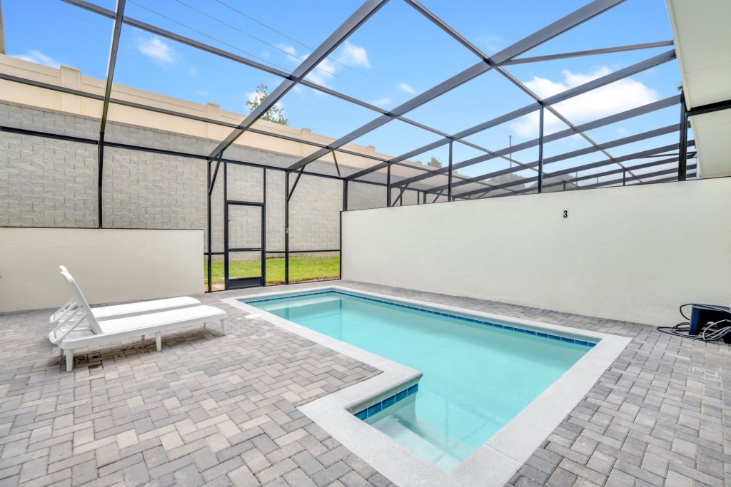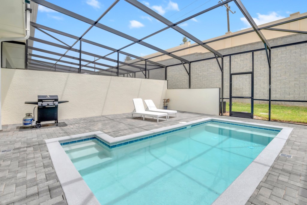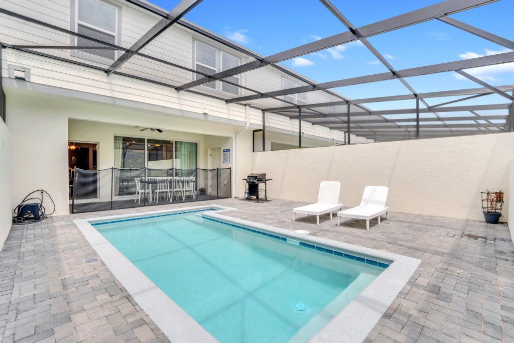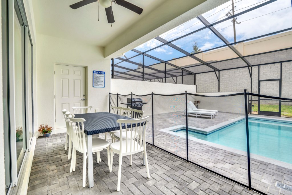 Outdoors, relax on the private screened-in pool deck, furnished with sun loungers and a dining area—perfect for soaking up the Florida sunshine. A child safety fence ensures peace of mind for families traveling with little ones.