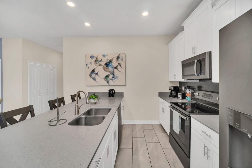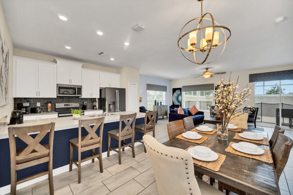 The fully equipped kitchen boasts granite countertops, stainless steel appliances, custom cabinetry, and a breakfast island, while the formal dining area offers space for gathering over shared meals. Outside, enjoy the private pool and comfortable patio seating—ideal for sunny afternoons or evening relaxation after a day of adventure.