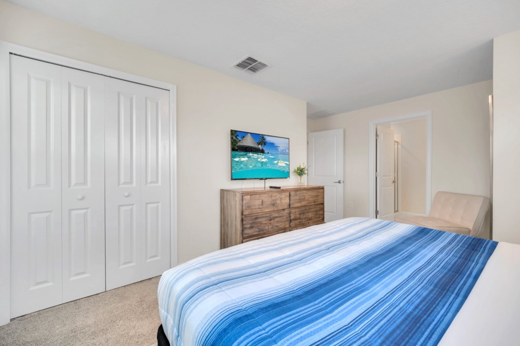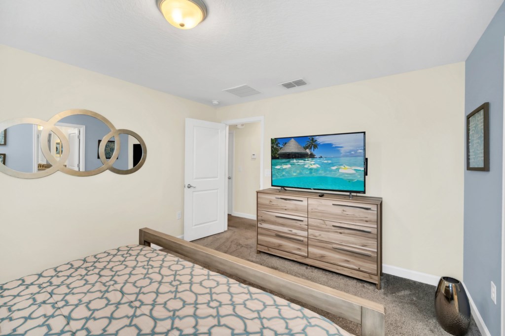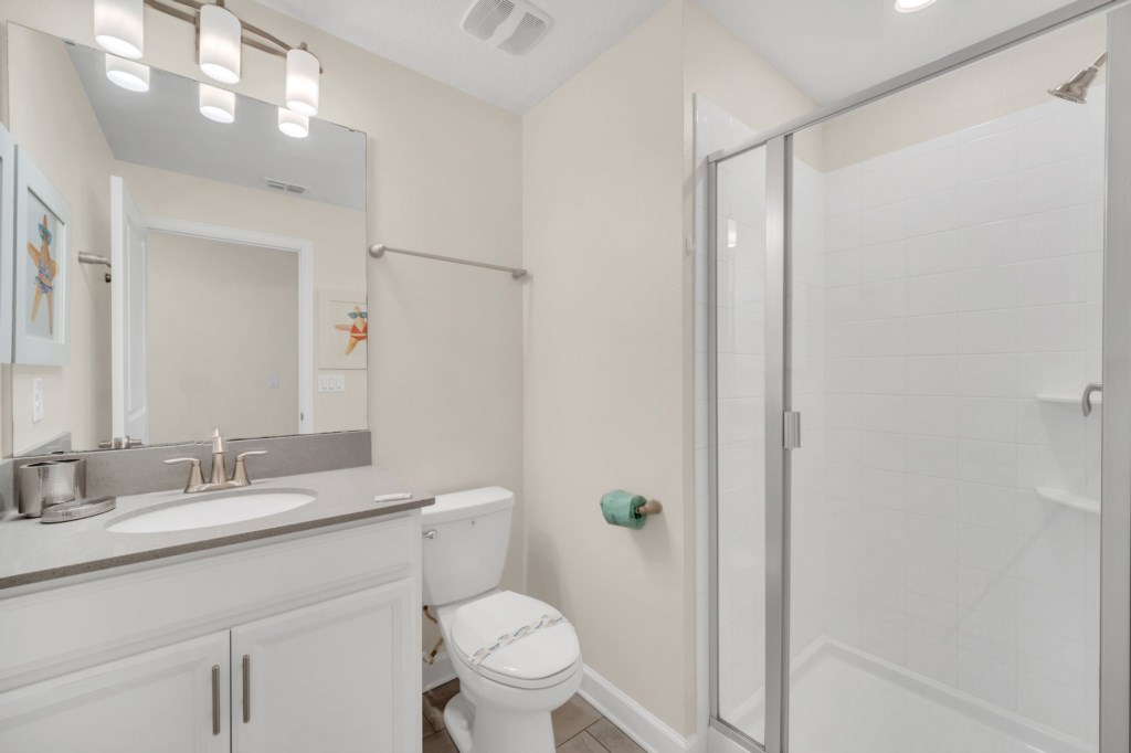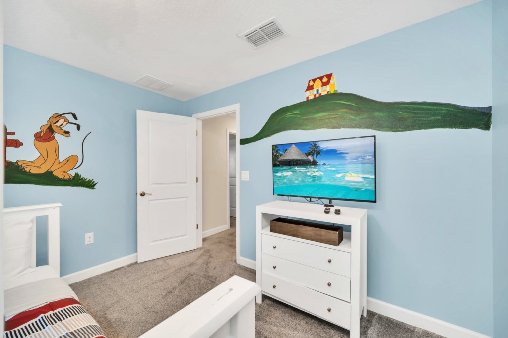 The first floor features a cozy Queen bedroom and a second bedroom with two Queen beds, along with a full bathroom for convenience. Upstairs, you’ll find two luxurious King suites with private bathrooms, plus a cheerful Mickey custom room with a full over twin bunk bed with a twin trundle perfect for younger guests.