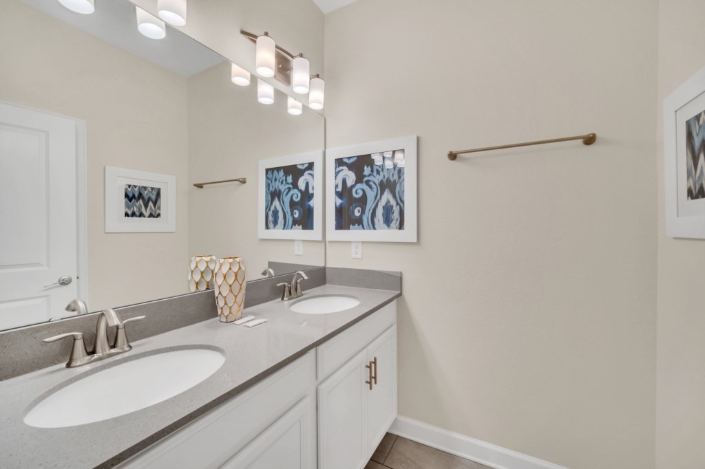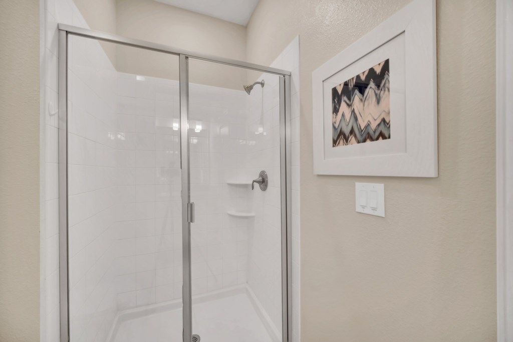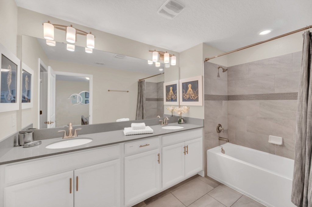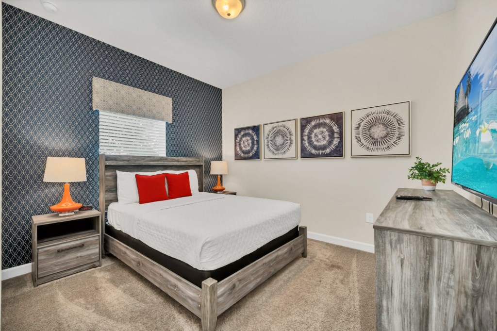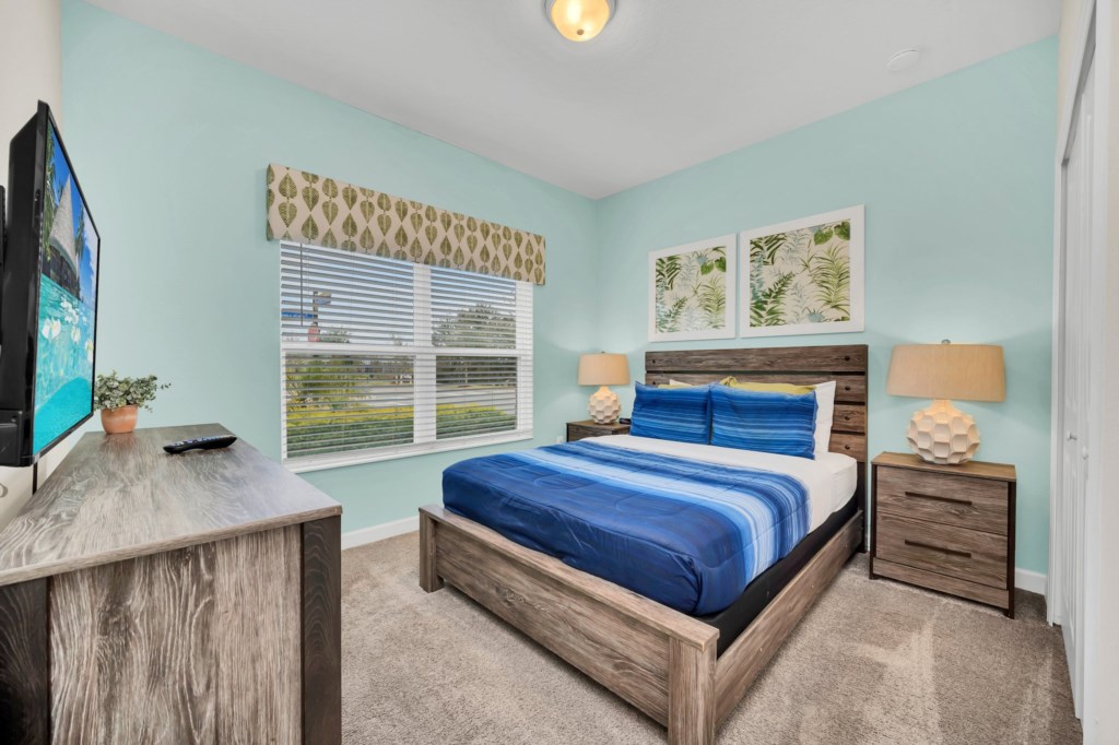 The first floor features a cozy Queen bedroom and a second bedroom with two Queen beds, along with a full bathroom for convenience. Upstairs, you’ll find two luxurious King suites with private bathrooms, plus a cheerful Mickey custom room with a full over twin bunk bed with a twin trundle perfect for younger guests.
